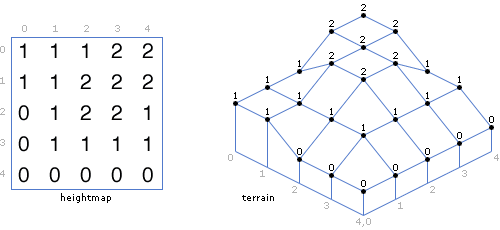 Let's begin by establishing some basics. The standard way of creating 3d terrains is through the use of heightmaps. A heightmap is simply a 2d array of values. Each value in the array represents the height of the terrain at that value's position. For example, if the cell at (2, 3) has a value of 5, then the terrain contains the point (2, 3, 5). To render a heightmap in three dimensions you create a mesh by iterating through the two indices of the array and set the height at each vertex to the value of the heightmap at that point. Typically, I use the X and Y axes for the two indices, and the Z axis for the height of the terrain, but any orientation will work.