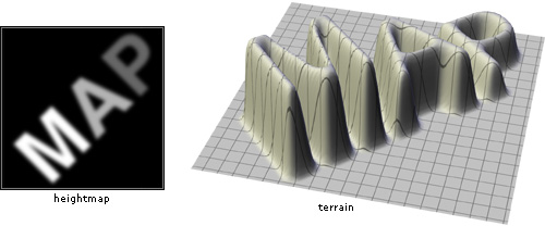 Heightmaps as ImagesAnother way to picture a heightmap is to think of it as a grayscale image, where the brightness of each pixel corresponds to the height of the terrain at that point. In this manner, dark regions on the image represent valleys and lighter regions represent peaks. For example: